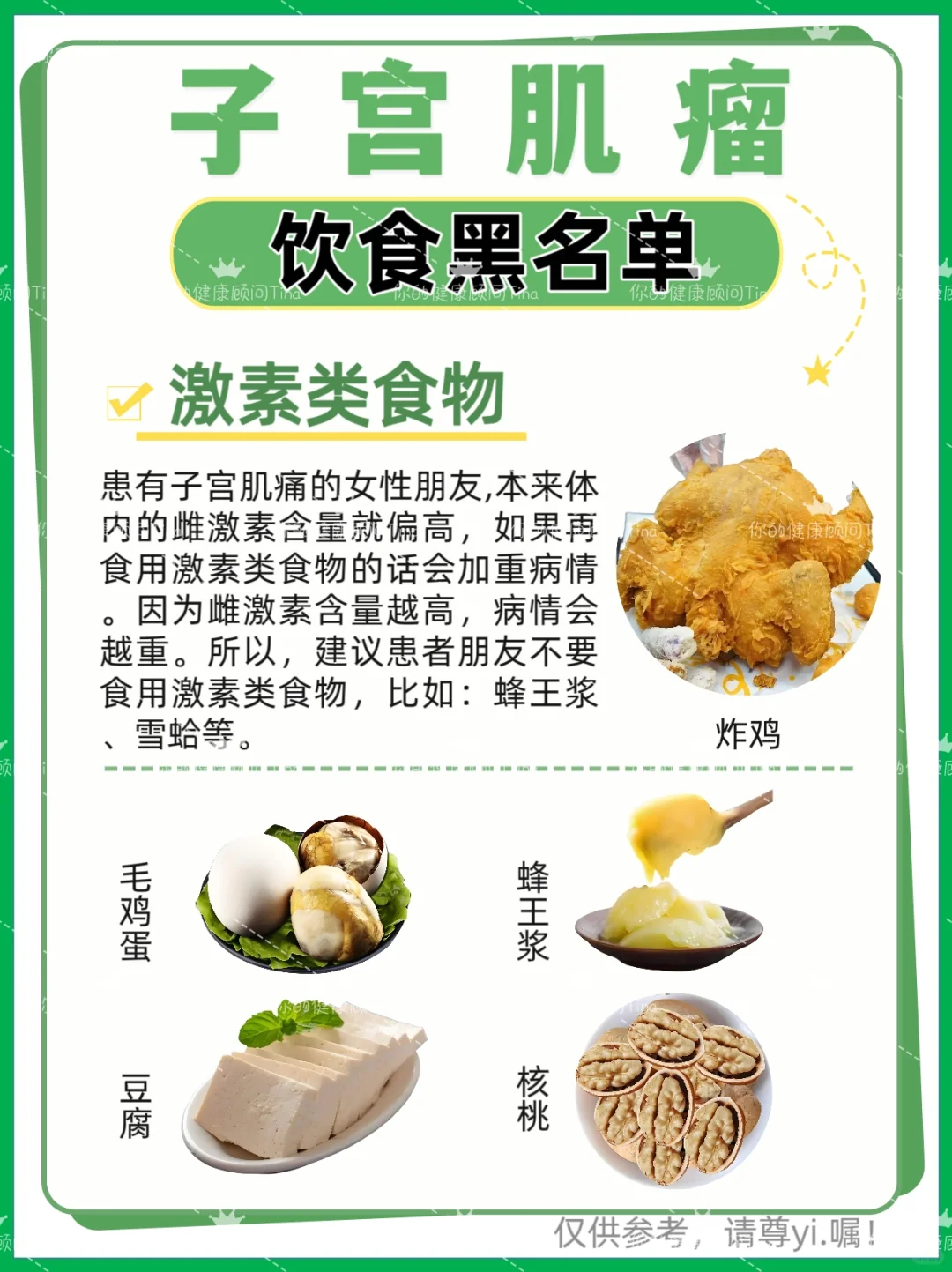 豆浆,鸡别吃,还有所有所谓的人工补品。其他我觉得还好。真实案例可比说那些都不能吃可靠些。