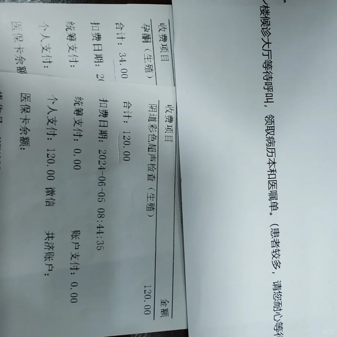 早起做超声(¥120),抽血(¥34)