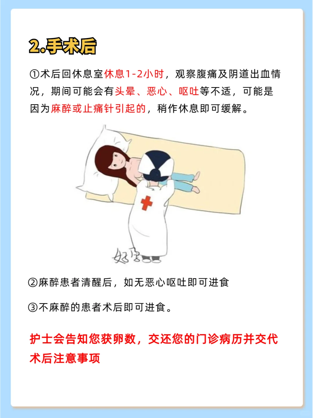 术过程中要充分放松请不要扭动身体、避免抬臀部,容易造成您取卵后的肌肉酸痛。✅手术后: